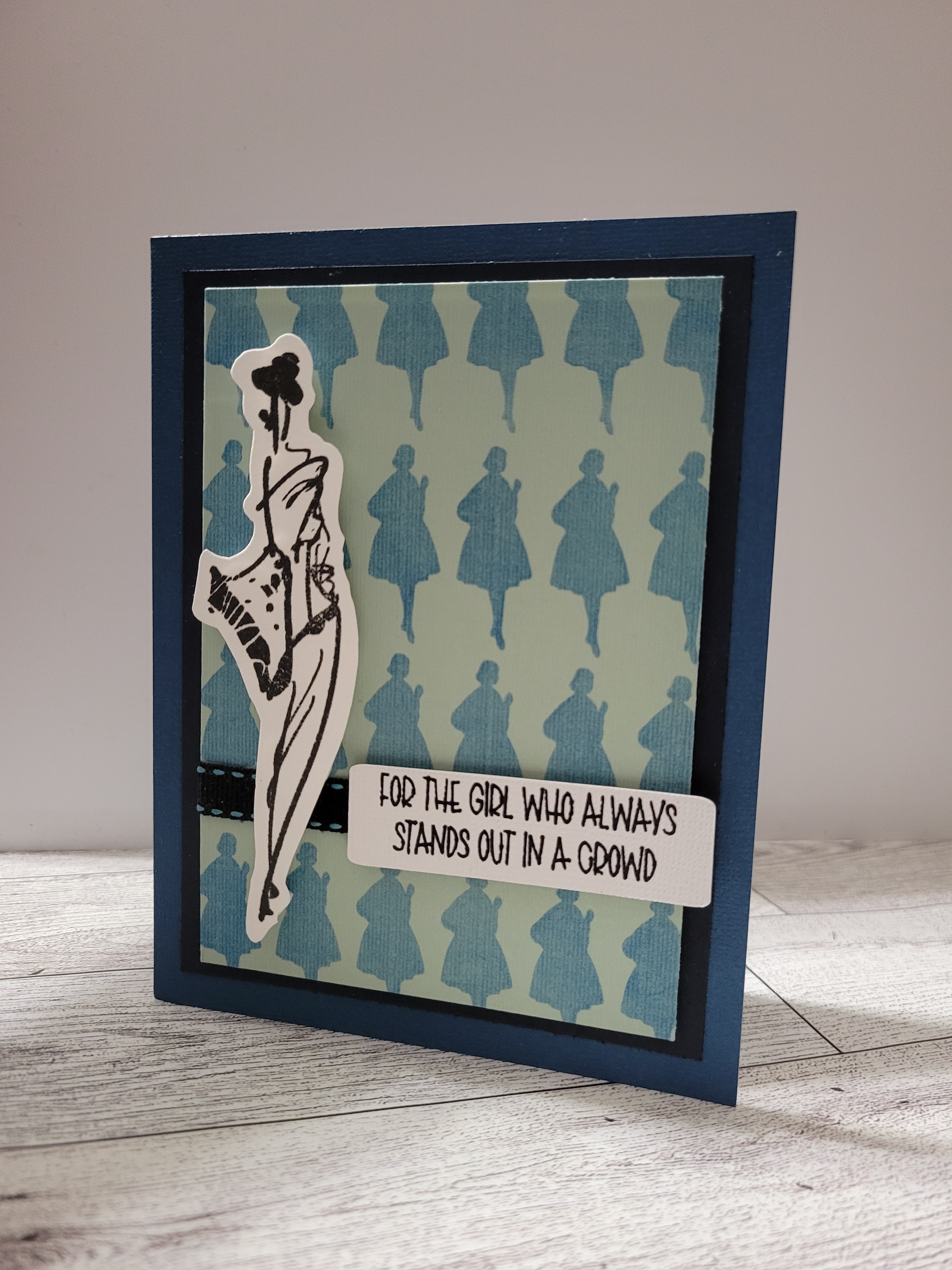 For this particular week, the goal was to use stencils. For this challenge, I decided to use a Picket Fence Studios stencil I had gotten some time ago that featured a pattern of the silhouette of a lady in a vintage dress, based on that, my card centered around an idea of fashion and then I got the idea of someone fashionably standing out.